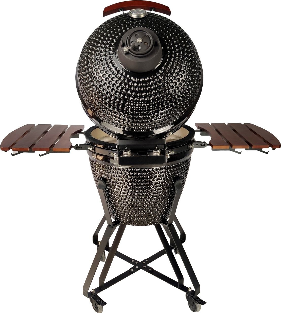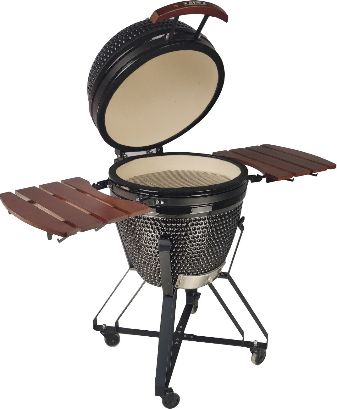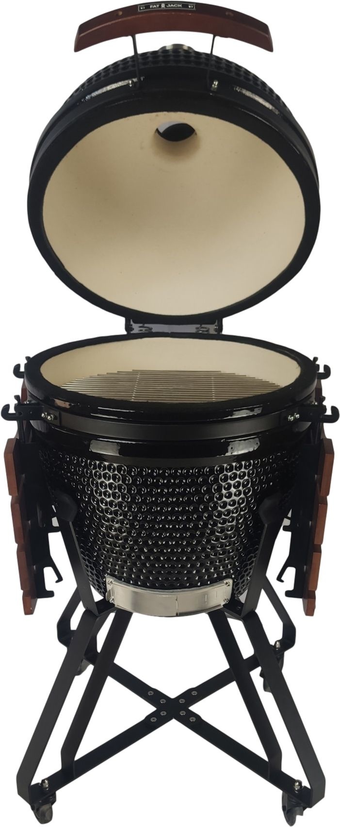 De Fat Jack Classic Large is gemaakt van hoogwaardig keramiek. De zwarte metalen onderdelen en gietijzeren top ventilatieschijf zijn kenmerkend voor zijn stoere, robuuste uiterlijk. Met zijn grillrooster van 47 cm. draait deze Jack zijn handen niet om voor een gezelschap van 10 personen. De Fat Jack Classic Large wordt geleverd met een glass fiber vilt die zorgt voor een perfecte luchtdichte afsluiting. Net als Jack staat ook de Classic Large stevig in zijn schoenen. Hij wordt geleverd inclusief een robuust zwart onderstel met stevige geremde wielen. De meegeleverde houten zijtafels zorgen voor voldoende werkruimte rond je kamado.